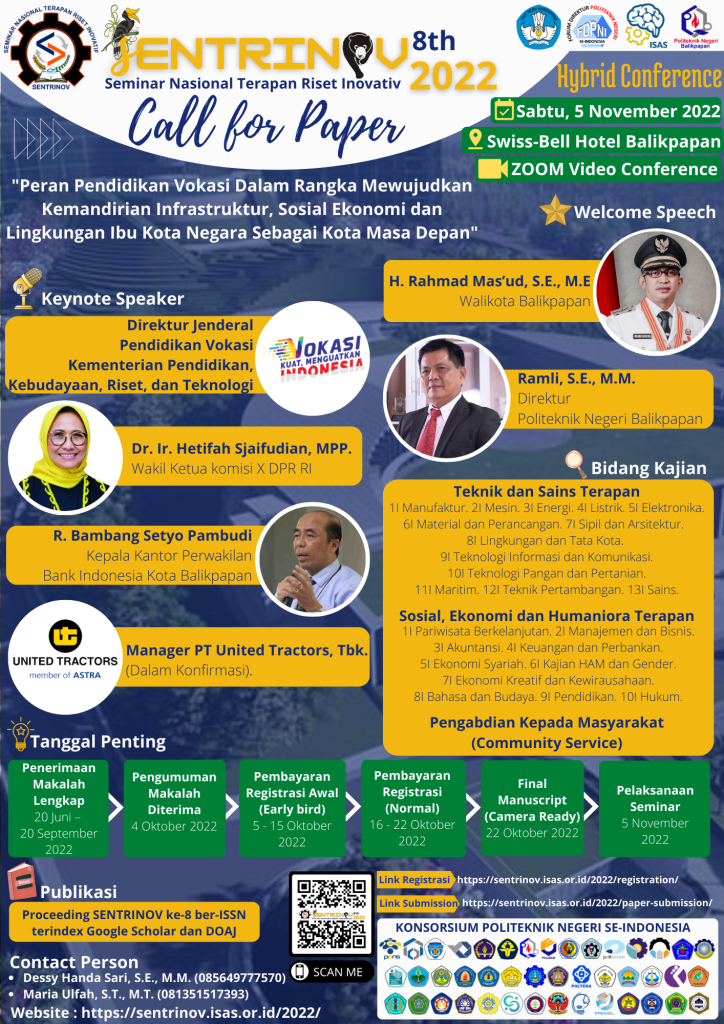 Pusat Penelitian dan Pengabdian Masyarakat (P3M) Poltekba kembali akan melaksanakan seminar. Ya Seminar Nasional Terapan Riset Inovatif (Sentrinov) ke-8 tahun 2022. Berlangsung di Swiss-Bell Hotel Balikpapan, 5 November 2022 mendatang, kegiatan ini merupakan gagasan oleh Forum Direktur Politeknik Negeri se-Indonesia (FDPNI). Ya dua pemateri akan diundang dalam seminar ini. Yakni Wakil Ketua Komisi X DPR RI, Dr. Ir. Hetifah Sjaifudian, MPP dan Deputi Direktur – Kepala Perwakilan BI Balikpapan, Bambang Setyo Pambudi. Agenda ini mengangkat tema “Peran Pendidikan Vokasi Dalam Rangka Mewujudkan Kemandirian Infrastruktur, Sosial Ekonomi dan Lingkungan Ibu Kota Negara Sebagai Kota Masa Depan”. Kepala Pusat Penelitian dan Pengabdian Masyarakat Poltekba, Ir. Ida Bagus Dharmawan, ST.,MSi mengatakan kegiatan ini bertujuan untuk mengembangkan keilmuan dibidang vokasi terapan dan membangun wahana sharing bagi para akademisi, mahasiswa, dan praktisi. Utamanya dalam melakukan riset di bidang teknologi terapan sehingga menunjang kemajuan keilmuan dan pengembangan pendidikan vokasi. Secara khusus, kata dia seminar ini ingin memfasilitasi para pelaksana penelitian dalam melaksanakan publikasi ilmiah dibidang teknologi terapan. Termasuk membangun network antara sesama pelaksana penelitian, akademisi, praktisi, dan birokrat terkait. “Termasuk mengembangkan minat dan kemampuan sivitas akademik Politeknik Negeri se-Indonesia dalam kegiatan penelitian dan inovasi teknologi terapan dibidang rekayasa maupun non rekayasa,“ kata Ir. Ida Bagus Dharmawan, ST.,M.Si. Memang, semakin berkembangannya geliat aktifitas perguruan tinggi vokasi di Indonesia, diharapkan selaras dengan produktifitas penelitian terapan yang berkontribusi langsung terhadap kesejahteraan masyarakat dan industri. Untuk itu diperlukan wadah diseminasi hasil penelitian dan perluasan networking antar pelaksana penelitian untuk mensosialisasikan dan saling mengkomunikasikan hasil riset terapan yang telah dilakukan. Pendidikan vokasi akhir-akhir ini mendapatkan perhatian yang cukup besar dari pemerintah. Dengan adanya penguatan pendidikan vokasi dimaksudkan agar lulusan perguruan tinggi tidak hanya terfokus pada jenis pendidikan akademik yang diarahkan untuk menjadi ilmuwan (scientist), dimana tempat bekerjanya sangat terbatas. Melainkan masyarakat diberikan peluang yang seluas-luasnya untuk memanfaatkan pendidikan vokasi untuk memperoleh keahlian tertentu yang sangat dibutuhkan oleh dunia usaha dan dunia industri. Sebagai strategi dalam usahanya untuk menopang eksistensi dan penguatan penelitian dan pengabdian yang berkelanjutan, menghadapi era tersebut diperlukan insan yang cerdas, kreatif dan inovatif. Hal ini menjadi tantangan besar bagi Politeknik di Indonesia untuk menghasilkan konsep keilmuan maupun teknologi baru yang mampu meningkatkan daya saing bangsa. Dengan latar belakang dan pemikiran tersebut, maka Forum Direktur Politeknik Negeri se-Indonesia (FDPNI) sepakat untuk mensinergikan potensi seluruh Politeknik Negeri se-Indonesia untuk berkarya bersama dan berperan aktif dalam pembangunan serta peningkatan perekonomian nasional melalui kegiatan Tri Dharma Perguruan Tinggi, salah satunya melalui kegiatan penelitian terapan. Agar hasil penelitian tersebut dapat dipahami dan dimanfaatkan langsung oleh masyarakat luas, maka perlu adanya kegiatan deseminasi dan sosialisasi bersama baik dalam skala nasional maupun internasional. Nah Sentrinov menjadi agenda seminar nasional yang telah diselenggarakan sejak 2015, dipelopori oleh Politeknik Negeri Semarang (Polines) bersama dengan Politeknik Negeri Malang (Polinema), Politeknik Negeri Bali (PNB), dan Politeknik Manufaktur Negeri Bangka Belitung, Politeknik Negeri Banguwangi, Politeknik Jember. Seminar ini merupakan sarana pertemuan para peneliti baik akademisi, praktisi, maupun pemerintah untuk saling berbagi ide, bertukar pengalaman, membangun kolaborasi dan kebersamaan sehingga semakin mendekatkan hasil penelitian yang bersifat terapan ke tahap industrialisasi dan pemanfaatan publik. ”Pada tahun 2022 ini Poltekba melalui P3M akan menyelenggarakan Sentrinov ke-8, dengan harapan adanya peningkatan dalam seminar ini. Dukungan yang luas kami butuhkan dalam rangka kesuksesan acara tersebut,“ ujarnya. Nah bagi yang berminat mengikuti kegiatan seminar ini, silahkan langsung menghubungi Bu Maria ( 0813 5151 7393 ) dan Bu Desy ( 0856 4977 7570). Dan untuk pelaksanaan, setiap peserta di masing-masing kategori dikenakan biaya pendaftaran. (lengkapnya lihat books) “Untuk peserta diperuntukan untuk Sivitas akademik perguruan tinggi, mahasiswa perguruan tinggi di wilayah Nasional Indonesia dan praktisi industri serta pelaksana penelitian di wilayah Nasional Indonesia. Jadi buruan daftar dan bergabung,“ pungkasnya. Klik disini untuk biaya kontribusi