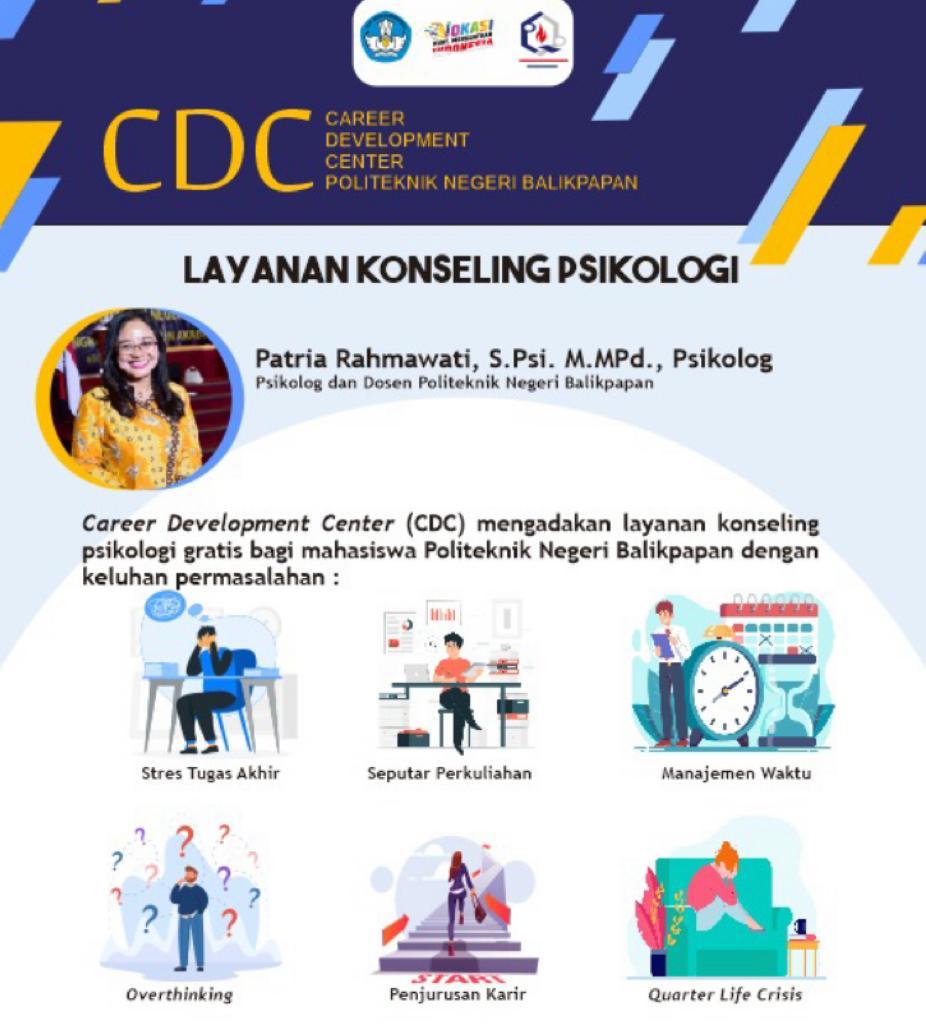 Politeknik Negeri Balikpapan melalui Career Development Center (CDC) membuka layanan konseling psikologi secara gratis bagi mahasiswa. Dengan dibimbing oleh Dosen Poltekba Patria Rahmawaty, S.Psi., M.MPd. Kepala UPT Career Development Center (CDC) Poltekba Rahmat Bangun Giarto, S.T., M.Eng mengatakan program ini dilakukan untuk membantu para mahasiswa. Tentunya agar mereka bisa semangat dalam mengerjakan tugas akhir. Pun konsultasi permasalahan pribadi seperti korban bullying hingga rendahnya kepercayaan diri mahasiswa dalam menempuh perkuliahan. “Program ini sudah dilakukan sejak Agustus 2021 lalu dan dikhususkan untuk para mahasiswa Poltekba secara gratis,” ujar Rahmat Bangun Giarto, S.T., M.Eng. Sejak dibuka, ia mengatakan awalnya, para mahasiswa masih terlihat canggung untuk mengikuti konsultasi ini. Namun, dengan seiring waktu berjalan, satu demi satu hadir untuk mengikuti konseling ini. “Sekarang, antusias ditunjukan mahasiswa cukup tinggi. Untuk waktu konseling nya dilakukan berdasarkan kesepakatan antara mahasiswa dengan psikologi,“ ujarnya. Ia pun berharap layanan ini dapat membebaskan diri mahasiswa dari kesulitan yang dihadapi terutama permasalahan dan membangun kepercayaan diri mahasiswa dalam menghadapi perkuliahan serta meminta arahan perihal penjurusan karir sesuai minat dan bakat. Sementara Patria Rahmawaty, S.Psi., M.MPd menambahkan selama memberikan konseling, berbagai hal diterima nya kepada mahasiswa. Biasanya menyangkut masalah pribadi yang berdampak pada perkuliahan serta masalah lainnya. “Semoga dengan konseling ini, dapat membantu mahasiswa untuk mengatasi masalah yang didapat yang dapat memberikan dampak dalam perkuliahan, sehingga masa studi tidak terhambat,“ harap Patria Rahmawaty, S.Psi., M.MPd. Berita ini telah tayang di kaltimkita.com