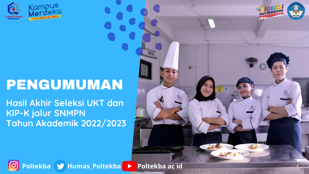Nomor 709/PL32/LL/2022 Ketua Panitia SPMB menetapkan hasil Seleksi Akhir Penerimaan Mahasiswa Baru Politeknik Negeri Balikpapan Jalur SNMPN Tahun Akademik 2022/2023. Pembayaran dan penyerahan berkas dan daftar ulang pada tanggal 24 Mei s.d 8 Juni 2022 Di Unit Layanan Terpadu (ULT) Gedung Direktorat Politeknik Negeri Balikpapan, sesuai persyaratan administrasi yang ditentukan pada laman https://poltekba.ac.id/tata-cara-pendaftaran-ulang-spmb-2022/ Download Pengumuman disini