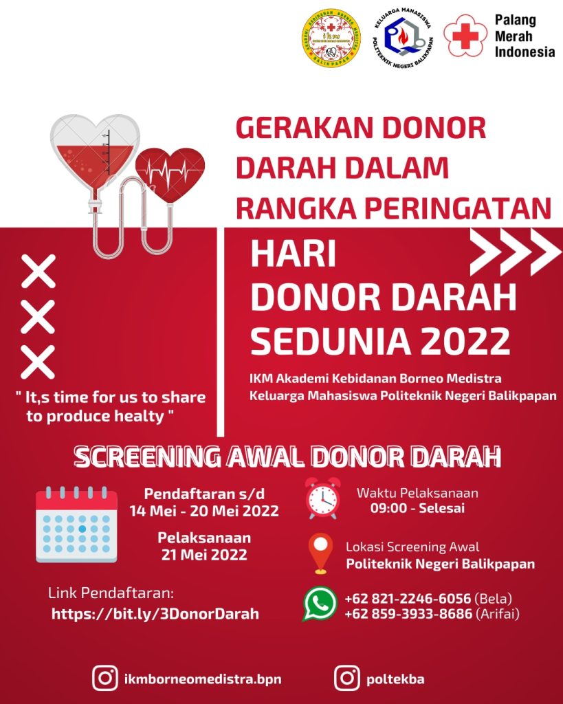 Hari Donor Darah Sedunia sebentar lagi diperingati. Tepatnya setiap tanggal 14 Juni. Memperingati momen tersebut, Politeknik Negeri Balikpapan bersama Akademi Kebidanan Borneo Medistra berencana menggelar donor darah yang akan dilaksanakan pada Sabtu (18/6/2022) bulan depan. Panitia Donor Darah Risna Zulfaidah mengatakan akan menargetkan 100-150 pendonor bisa berpartisipasi. Disamping memperingati hari donor darah, juga sekaligus membantu Palang Merah Indonesia (PMI) menyiapkan stok darah. “Semoga kegiatan nanti bisa berjalan sukses. Kami mengajak para masyarakat untuk berpartisipasi dalam aksi donor darah ini,“ kata Risna Zulfaidah, Selasa (17/5/2022). Hari Donor Darah Sedunia sebentar lagi diperingati. Tepatnya setiap tanggal 14 Juni. Memperingati momen tersebut, Politeknik Negeri Balikpapan bersama Akademi Kebidanan Borneo Medistra berencana menggelar donor darah yang akan dilaksanakan pada Sabtu (18/6/2022) bulan depan. Panitia Donor Darah Risna Zulfaidah mengatakan akan menargetkan 100-150 pendonor bisa berpartisipasi. Disamping memperingati hari donor darah, juga sekaligus membantu Palang Merah Indonesia (PMI) menyiapkan stok darah. “Semoga kegiatan nanti bisa berjalan sukses. Kami mengajak para masyarakat untuk berpartisipasi dalam aksi donor darah ini,“ kata Risna Zulfaidah, Selasa (17/5/2022). Para panitia donor darah saat melakukan rapat internal Bagi para masyarakat yang ingin mendonor, mahasiswi Poltekba ini menambahkan bisa langsung melakukan pendaftaran melalui link https://bit.ly/3DonorDarah. ”Pendaftaran dibuka pada 14-20 Mei 2022. Setelah itu dilaksanakan screening awal berupa tes kesehatan di Poltekba sehari setelah penutupan pendaftaran,“ ujarnya. Ia pun berharap kegiatan ini bisa berjalan sukses. Tentunya kolaborasi Poltekba-Akademi Kebidanan Borneo Medistra demi memastikan dan membantu stok kantong darah di Balikpapan bisa terpenuhi. “Sasaran utama kami yakni masyarakat umum. Semoga target pendonor bisa terpenuhi,“ harapnya. Bagi kalian yang ingin mendapatkan informasi lebih lanjut perihal pendaftaran bisa langsung menghubungi Arifa’i (085939338686) dan Bela (082122466056) Berita ini telah tayang di kaltimkita.com