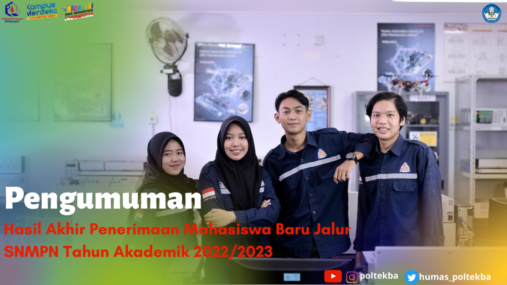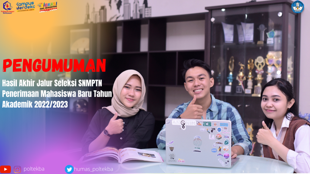 Pengumuman Nomor 532/PL32/LL/2022 1. Ketetapan Hasil SeleksiKetua Panitia SPMB menetapkan Hasil Seleksi Akhir Penerimaaan Mahasiswa Baru (SPMB) Politeknik Negeri Balikpapan Jalur Seleksi SNMPN Tahun Akademik 2022/2023, sesuai daftar nama terlampir. 2. Mengumpulkan Berkas Pengajuan UKT (Uang Kuliah Tunggal) pada tanggal 09 s.d 13 Mei 2022 di kumpulkan di Unit Layanan Terpadu (ULT) Gedung Direktorat Politeknik Negeri Balikpapan menggunakan Map berwarna biru, Sesuai Persyaratan administrasi yang telah ditentukan pada laman https://poltekba.ac.id/berita/spmb/ketentuan-uang-kuliah-tunggal-ukt/, bagi yang tidak mengumpulkan berkas pengajuan, maka Uang Kuliah Tunggal (UKT) ditetapkan pada kelompok tertinggi pada prodi tersebut. 3. Pengumuman hasil seleksi pengajuan UKT akan diumumkan pada tanggal 23 Mei 2022. Download Pengumuman Lengkap disini