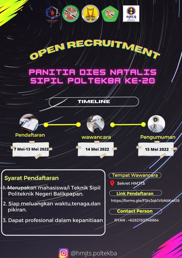 Tepat 25 Juni 2022, Dies Natalis ke-20 Jurusan Teknik Sipil Politeknik Negeri Balikpapan. Sejumlah kegiatan pun berencana dilaksanakan sejak pembukaan Minggu (29/5/2022) di Gedung Terpadu Lantai nanti hingga awal Juli mendatang. Ketua Himpunan Mahasiswa Jurusan (HMJ) Teknik Sipil Poltekba Adam Malik mengatakan mengundang seluruh alumni teknik sipil maupun mahasiswa dan mahasiswi aktif untuk dapat hadir di rangkaian dies natalis. Mengingat, ada lomba dan seminar yang berencana dilaksanakan. ”Kami mengajak semua alumni dan mahasiswa aktif teknik sipil untuk hadir. Dies Natalis ini momentum sekaligus reunian bagi setiap angkatan,” ujar Adam Malik, Minggu (8/5/2022). HMJ Teknik Sipil Poltekba menggelar rapat internal menyambut Dies Natalis ke-20. Salah satu lomba yang akan dilaksanakan yakni Lomba Autocad pada 4 Juni 2022 mendatang. Mengangkat tema membangun rumah tinggal bernuansa tropis. Pun di 11 Juni 2022 nanti, melaksanakan seminar dengan tema building information modelling. ”Semua kegiatan ini dibuka untuk umum. Jadi buruan berpartisipasi dalam rangkaian dies natalis,“ katanya. Sementara, demi memperlancar rangkaian kegiatan, HMJ Teknik Sipili tengah membuka pendaftaran kepanitiaan 7-13 Mei 2022. Ditujukan kepada para mahasiswa dan mahasiswi aktif teknik sipil. “Bagi yang berminat bisa langsung mengisi form kepanitiaan di https://bit.lyOprecPanitiaDiesNatalisSipil2022. Rencananya proses wawancara dan pengumuman akan dilakukan pada 14-15 Mei 2022 nanti. Siapapun boleh mendaftar, yang terpenting siap meluangkan waktu, tenaga dan pikiran serta dapat profesional dalam kepanitiaan,“ ajaknya. Ia pun berharap dies natalis yang akan terlaksana bisa terealisasi sesuai dengan rencana yang disiapkan, karena kegiatan ini baru ada di tahun ini. Berita ini telah tayang di kaltimkita.com