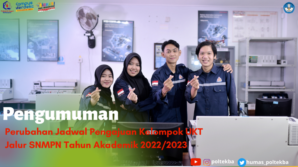 Pengumuman Nomor 538/PL32.1/LL/2022 Perihal Perubahan Jadwal Pengajuan Kelompok UKT Jalur SNMPN 2022 Sehubungan dengan Surat Keputusan Bersama Menteri Agama, Menteri Ketenagakerjaan, dan Menteri Pendayagunaan Aparatur Negara dan Reformasi Birokrasi Republik Indonesia dan Surat Edaran Direktur Politeknik Negeri Balikpapan Nomor 0595/PL32/KP/2022 tentang Cuti Bersama memperingati Hari Raya Idul Fitri 1443 Hijriah Di Lingkungan Politeknik Negeri Balikpapan dilaksanakan pada tanggal 29 April s.d 08 Mei 2022. Perlu disampaikan beberapa hal sebagai berikut : Download pengumuman lengkap disini
