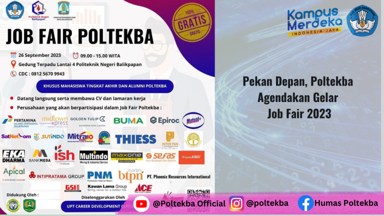 Politeknik Negeri Balikpapan berencana akan menggelar Job Fair 2023, Selasa (26/9/2023) pekan depan. Total ada 27 perusahaan berpartisipasi oleh garapan Poltekba dengan kerjasama SMKN 3 Penajam Paser Utara dan SMK Airlangga.Wakil Direktur III Bidang Kemahasiswaan dan Kerjasama Poltekba, Candra Irawan, S.T., M.Si mengatakan job fair ini diperuntukan untuk lulusan SMK dan Politeknik Negeri Balikpapan. Tentunya, pelaksanaan ini dengan harapan bagaimana putra dan putri Balikpapan bisa mendapatkan pekerjaan yang baik. Dengan begitu, membuat perekonomian Balikpapan turut meningkat.“Jika pengangguran sedikit, berarti perekonomian meningkat. Kompetensi jika ikut meningkat melalui hasil pendidikan,” kata Candra Irawan, S.T., M.Si, Sabtu (23/9/2023).Dalam ajang ini, kata dia Direktur Poltekba sangat mendukung job fair. Mengingat, kegiatan ini sekaligus mendukung Indikator Kerja Utama (IKU) Direktur Poltekba dengan Kemendikbudristek.“Jika ini terserap, minimal 70 persen dari jumlah mahasiswa Poltekba mendaftar bisa diterima, maka sudah sesuai dengan IKU Direktur Poltekba,“ jelasnya. Ia mengajak kepada para lulusan baik di tingkat SMA maupun alumni Poltekba untuk hadir dalam job fair. Peluang masuk dunia kerja terbuka lebar dengan total 27 perusahaan yang berpartisipasi.“Berharap banyak pelamar berpartisipasi dalam kegiatan job fair. Dan kepada semua perusahaan yang berpartisipasi, terima kasih sudah meramaikan kegiatan job fair nanti,” tutupnya.