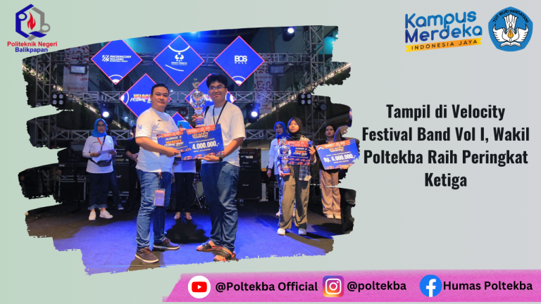 Wakil Politeknik Negeri Balikpapan tampil di Velocity Festival Band Vol I. Menampilkan The Band Itz, sukses meraih peringkat ketiga pada kategori pelajar di Food Avenue Balikpapan Ocean Square (BOS), Minggu (24/9/2023). Selain meraih peringkat ketiga, wakil Poltekba juga sukses menyabet vokalis terbaik oleh Alya Febrianti.Pada personel The Band Itz, selain Alya juga ada Sandryand Andreas Tobing sebagai Bassist, Muhammad Fikri Setiawan Gitaris 1, Mochamad Rizky Pramudya Gitaris 2 dan Muhammad Faisal Rafly Drummer.Kepada media ini, Alya Febrianti mengatakan cukup puas dengan hasil yang didapat. Meski target peringkat pertama gagal terealisasi. “Memang kami akui, persiapan terbilang cukup singkat. Makanya tetap puas dengan hasil ini,” ujar Ketua UKM Musikus Poltekba, Izmi Dhea Annisa, Rabu (27/9/2023).Dalam ajang ini, kata dia tantangan cukup berat. Selain event besar seperti ini menghadirkan peserta yang mendaftar cukup banyak, juga harus mengaransemen lagu mars patriot olahraga. “Lagu mars patriot olahraga masih asing di telinga. Ini jadi tantangan luar biasa bagi kami,” jelasnya.Usai event ini, kata dia belum ada agenda tampil di kegiatan eksternal. Saat ini, lebih banyak fokus pengembangan kegiatan internal. “Untuk saat ini, salah satu kegiatan pengembangan internal UKM Musikus lakukan yaitu regenerasi anggota UKM Musikus untuk mencari pemusik-pemusik baru,” akunya.Untuk diketahui, UKM Musikus merupakan salah satu organisasi Poltekba yang menaungi The Band Itz serta band-band lainnya.
