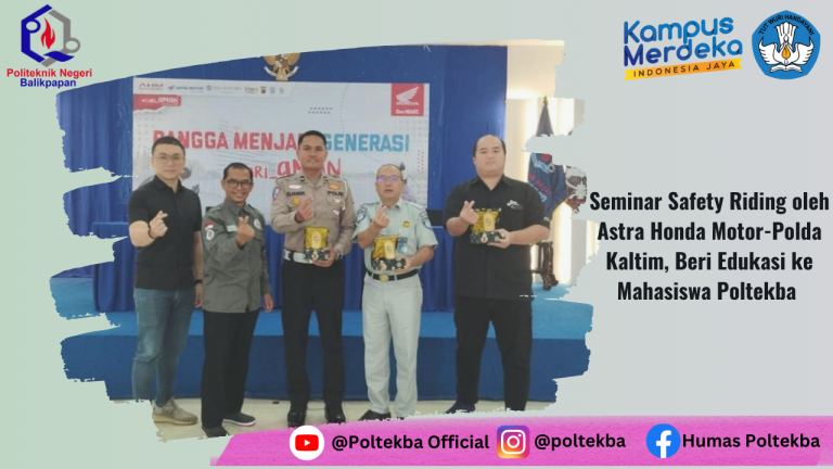 Politeknik Negeri Balikpapan menjadi host dalam seminar safety riding bertajuk Bangga Menjadi Generasi “Cari Aman”. Garapan Astra Honda Motor (AHM) Balikpapan bersama Jasa Raharja dan Polda Kaltim, Kamis (21/9/2023) lalu, dihadiri oleh 175 mahasiswa.Wakil Direktur III Bidang Kemahasiswaan dan Kerjasama Poltekba, Candra Irawan, S.T., M.Si mengatakan para mahasiswa yang hadir, sebanyak 75 persen berasal dari mahasiswa baru.“Kegiatan ini bertujuan untuk mengedukasi para mahasiswa bagaimana tahu cara berkendara yang baik. Bagaimana maksud dan tujuan safety riding,” ujar Candra Irawan, S.T., M.Si.Mengundang mahasiswa baru, menurutnya karena mereka merupakan masa transisi dari bangku SMA ke perkuliahan. Sehingga perilaku di masa SMA, tidak lagi dibawa ke bangku kuliah.“Ada edukasi yang didapat mereka dengan tidak ugal-ugalan saat berkendara. Karena hal itu akan mengakibatkan fatal bagi mereka sendiri,” jelasnya.Memang, saat ini kata dia angka kecelakaan berkendara didominasi oleh pelajar. Tercatat di angka 70 persen. “Makanya seminar ini diadakan. Agar tahu bagaimana berkendara yang benar. Sehingga meminimalisir angka kecelakaan,” akunya.Ia pun berharap acara seminar ini bisa terlaksana setiap tahun. Memberikan edukasi bagi mahasiswa baru. Dengan begitu, mereka bisa menjadi pelopor keselamatan bagi teman-teman kampusnya.“Jangan untuk sekali ini saja ada seminar. Berharap ada terus secara berkelanjutan untuk mahasiswa baru, sehingga ada edukasi didapat,” harapnya