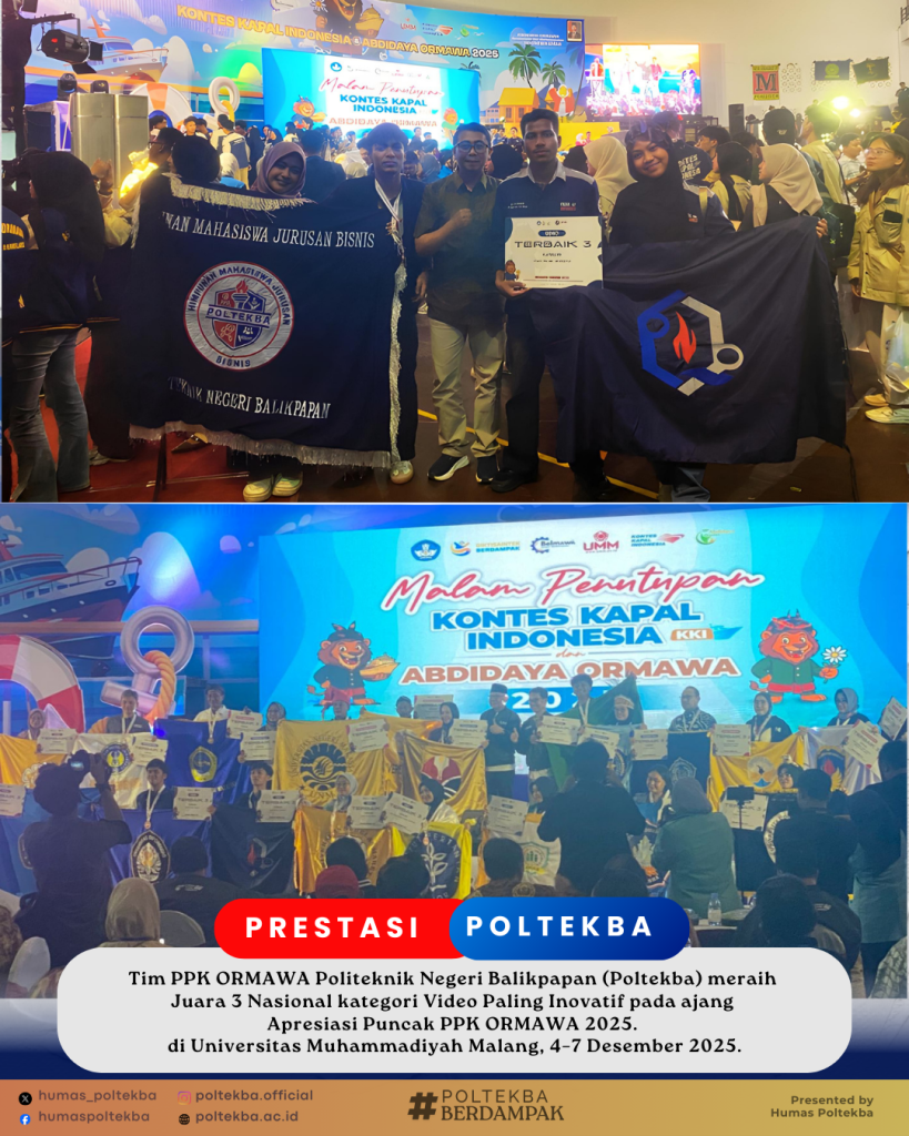 Tim Program Penguatan Kapasitas Organisasi Kemahasiswaan (PPK ORMAWA) Politeknik Negeri Balikpapan (Poltekba) mencatat pencapaian membanggakan pada ajang Apresiasi Puncak PPK ORMAWA 2025. Dalam kegiatan yang berlangsung di Universitas Muhammadiyah Malang pada 4–7 Desember 2025 itu, tim Poltekba meraih Juara 3 Nasional untuk kategori Video Paling Inovatif. Prestasi ini menjadi signifikan karena untuk pertama kalinya tim PPK ORMAWA Poltekba berhasil memperoleh pendanaan dari Kemendikbudristek dalam program yang bertujuan memperkuat kapasitas organisasi kemahasiswaan. Tim tersebut berasal dari Himpunan Mahasiswa Jurusan (HMJ) Bisnis dan dibimbing oleh dosen pendamping, Ferdy Novri, S.Si., M.M. Keberhasilan tim Poltekba diraih melalui proses seleksi yang ketat. Mereka mampu unggul dari lebih dari 4.143 proposal yang diajukan perguruan tinggi di seluruh Indonesia dan bersaing dengan 530 institusi. Prestasi tersebut juga menempatkan Poltekba sebagai satu-satunya organisasi kemahasiswaan dari Kalimantan Timur yang lolos hingga tahap nasional serta mendapat undangan resmi pada malam penganugerahan. Wakil Direktur III Bidang Kemahasiswaan dan Kerja Sama, Candra Irawan, S.T., M.Si, menyampaikan apresiasinya atas capaian tersebut. Ia menilai keberhasilan ini menunjukkan kemampuan mahasiswa Poltekba untuk berkompetisi di tingkat nasional melalui karya inovatif dan kolaborasi yang kuat. “Kami berharap keberhasilan ini menjadi motivasi bagi seluruh organisasi kemahasiswaan untuk terus berinovasi dan membawa nama kampus ke level nasional maupun internasional. Terima kasih kepada seluruh pihak yang telah mendukung, terutama pimpinan kampus yang memfasilitasi keberangkatan tim ke Malang,” ujar Candra Irawan. Direktur Politeknik Negeri Balikpapan, Dr. Emil Azmanajaya, S.T., M.T, juga memberikan apresiasi atas prestasi tersebut. Menurutnya, capaian ini merupakan bukti nyata sinergi antara mahasiswa, dosen pembimbing, dan pimpinan kampus dalam melahirkan karya yang bermakna. “Poltekba akan terus mendukung penuh setiap langkah inovatif mahasiswa dalam program PPK ORMAWA dan kegiatan pengembangan kapasitas lainnya,” tutur Dr. Emil Azmanajaya. Dosen pendamping, Ferdy Novri, menjelaskan bahwa penghargaan tersebut merupakan hasil dari proses panjang sejak tahap seleksi administrasi, presentasi, seleksi kementerian, hingga visitasi lapangan. Prestasi ini sekaligus menegaskan komitmen Poltekba dalam mendorong mahasiswanya untuk terus berkarya dan berkontribusi bagi masyarakat melalui program-program pemberdayaan yang berkelanjutan.