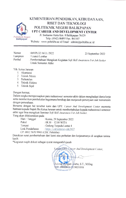 Berikut Pengumuman Perihal Kegiatan Soft Skill Awareness For Job Seeker Untuk Semester Akhir Mahasiswa/i Politeknik Negeri Balikpapan yang dilaksanakan pada hari Kamis, 29 September 2022. Diharapkan bagi mahasiswa/i semester akhir dapat mengikuti kegiatan tersebut.
