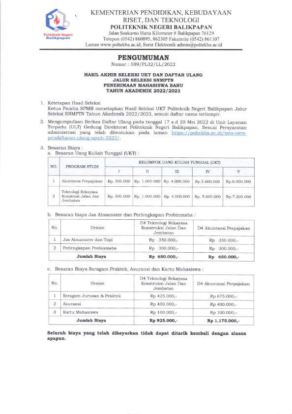 Berikut Pengumuman Nomor 589/PL32/LL/2022 perihal Pengumuman Hasil Akhir Seleksi UKT & Daftar Ulang Jalur SNMPTN Penerimaan Mahasiswa Baru Tahun Akademik 2022/2023. Download pengumuman disini