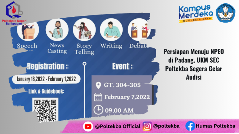 Kesempatan emas terbuka bagi para mahasiswa Politeknik Negeri Balikpapan (Poltekba). Ya melalui UKM Students of English Community (SEC) menggelar audisi untuk mempersiapkan tampil di National Polytechnic English Olympics (NPEO) Padang, Sumatera Barat, Mei 2022.
